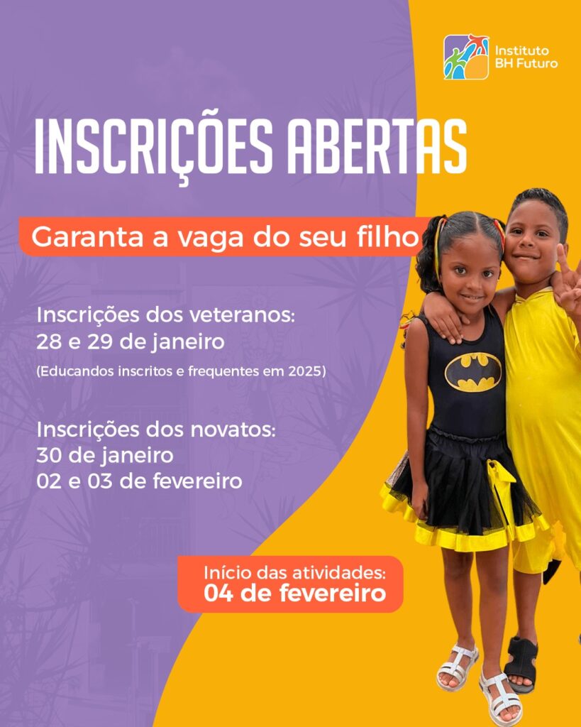 Nos dias 28 e 29 de janeiro serão realizadas as inscrições dos veteranos, ou seja, os alunos que foram matriculados e frequentes em 2025. Já nos dias 30 de janeiro, 2 e 3 de fevereiro, estarão abertas as matrículas para os novatos. Todas as inscrições são feitas de forma PRESENCIAL no Instituto BH Futuro.