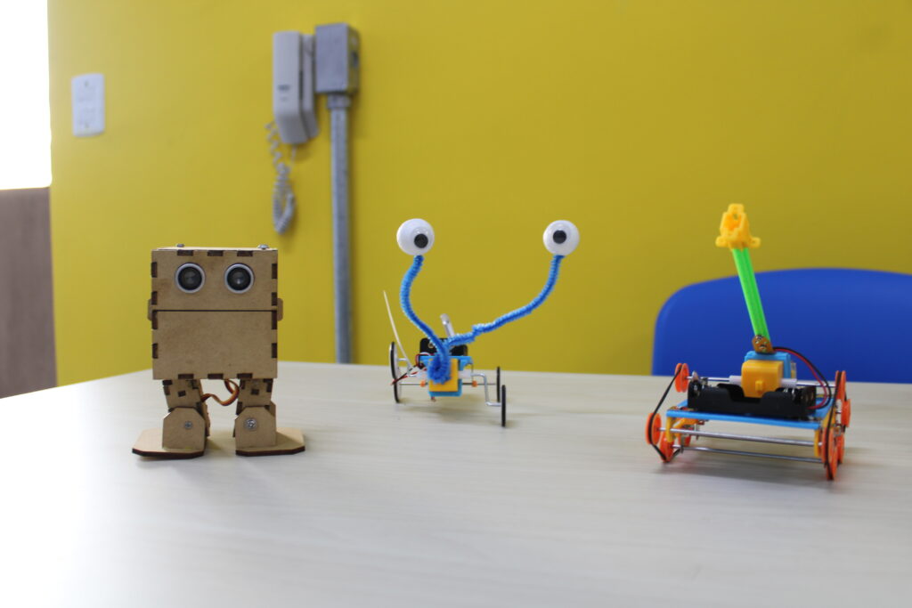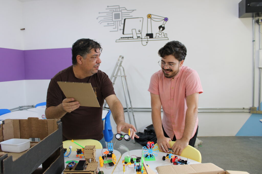 As aulas são baseadas em desafios e projetos. Os alunos aprendem fazendo, com atividades práticas e colaborativas.