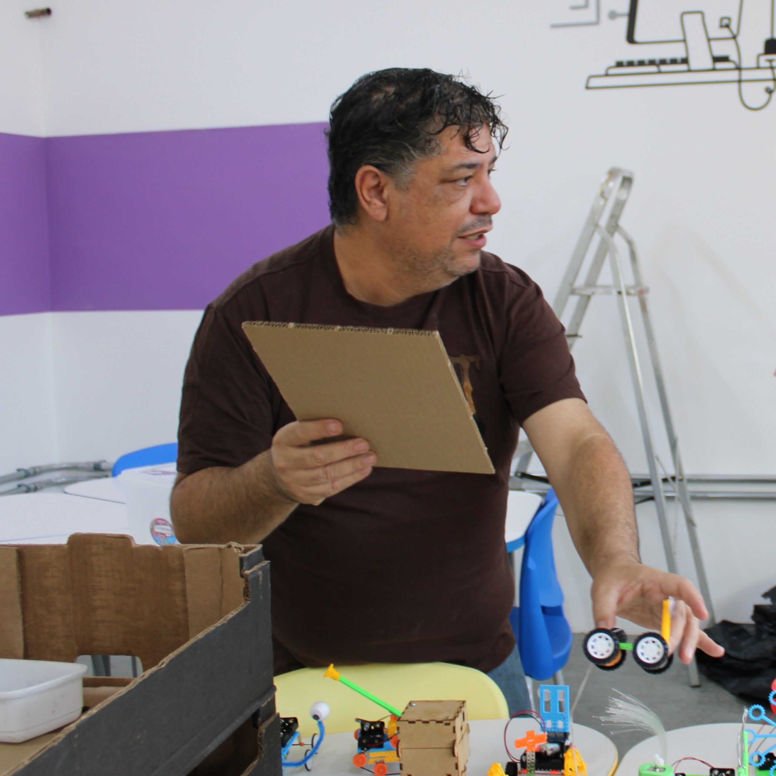 Técnico em Informática e Eletrotécnica, Graduado em Engenharia de Controle e Automação. Atua como juiz em torneios internacionais de robótica. Ensina lógica de programação e algoritmos básicos, montagem e programação de robôs educacionais, conceitos de sensores, motores e automação.